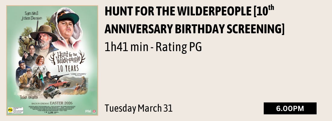 HUNT FOR THE WILDERPEOPLE [10th ANNIVERSARY] - it's only fair to have a Birthday Screening of the quintessential Kiwi comedy, which turns 10 on March 31st this year! Tickets just $14 each.