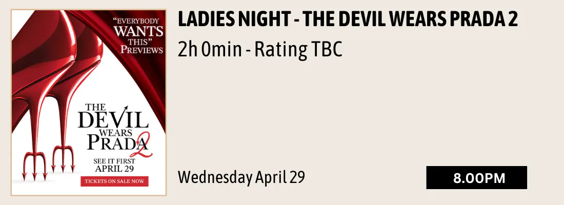 Our next Ladies Night screening is THE DEVIL WEARS PRADA 2 on Wednesday, April 29 (click the image below to book):